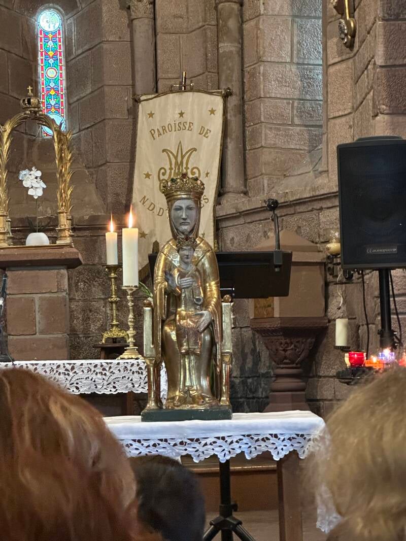 Au Moyen-Age, une église est construite pour abriter une statue de la Vierge qui, suite à des miracles, développe un pélerinage. En 1854, l'église fut reconstruite à la suite d'un incendie. L'église romane en grès rouge se compose d'une nef s'ouvrant sur un choeur présentant une abside à trois pans. Les cinq baies du choeur s'ouvrent par un arc supporté par deux colonnettes surmontées de chapiteaux historiés ou à feuillage. Le clocher fut ajouté en 1854, de plan carré. A la même époque est ajouté un bas-côté au sud.